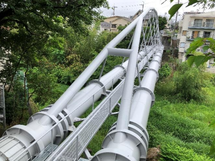地中に埋設されている管路の点検は、職員や点検整備工事受注者の管路巡視により、道路等からの漏水発生や地面に変状などがないことを確認しています。河川などを横断している水管橋については、これらの巡視に加えて4年毎に詳細な点検も実施することとしています。